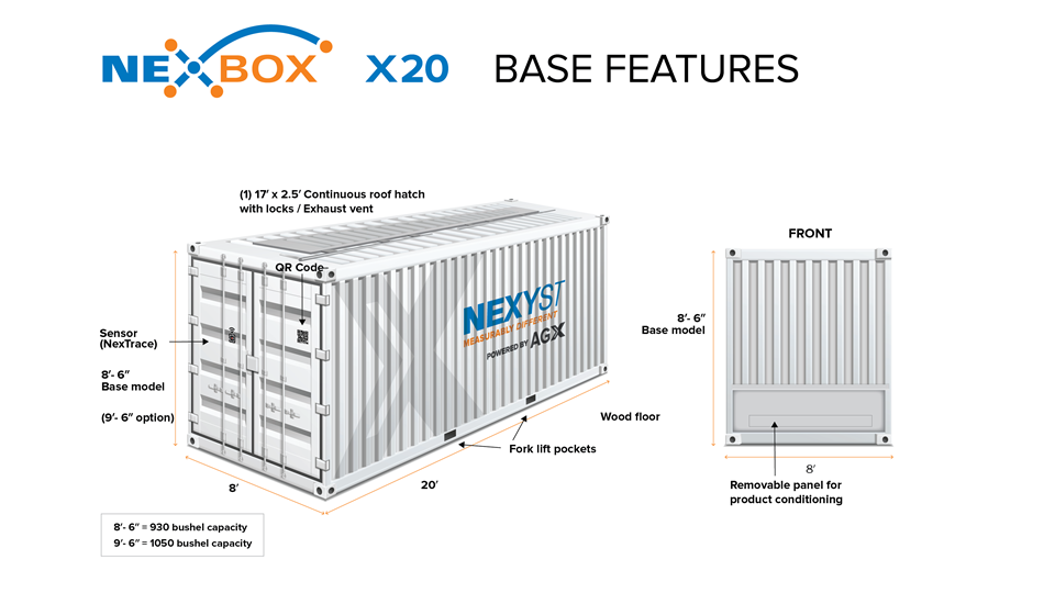 The NexProcess is designed to cut costs associated with the transportation and storage of agricultural products. Additionally, the mobility aspect of the NexBox provides liquidity versus the sunken costs of on-farm or commercial grain storage systems. The Nexyst 360 solution can reduce costs in the following areas: